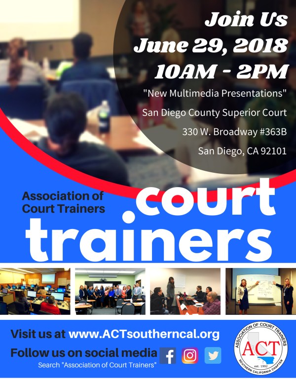 Association of Court Trainers will be hosting a workshop on June 29, 2018, in San Diego County Superior Court. The workshop will focus on the “New Multimedia Presentations”. This is a free event where trainers from all southern California courts come together to share training information, expertise, and resources. To register for this event, click “Register Now” button below. For more information, visit us at www.actsoutherncal.org.