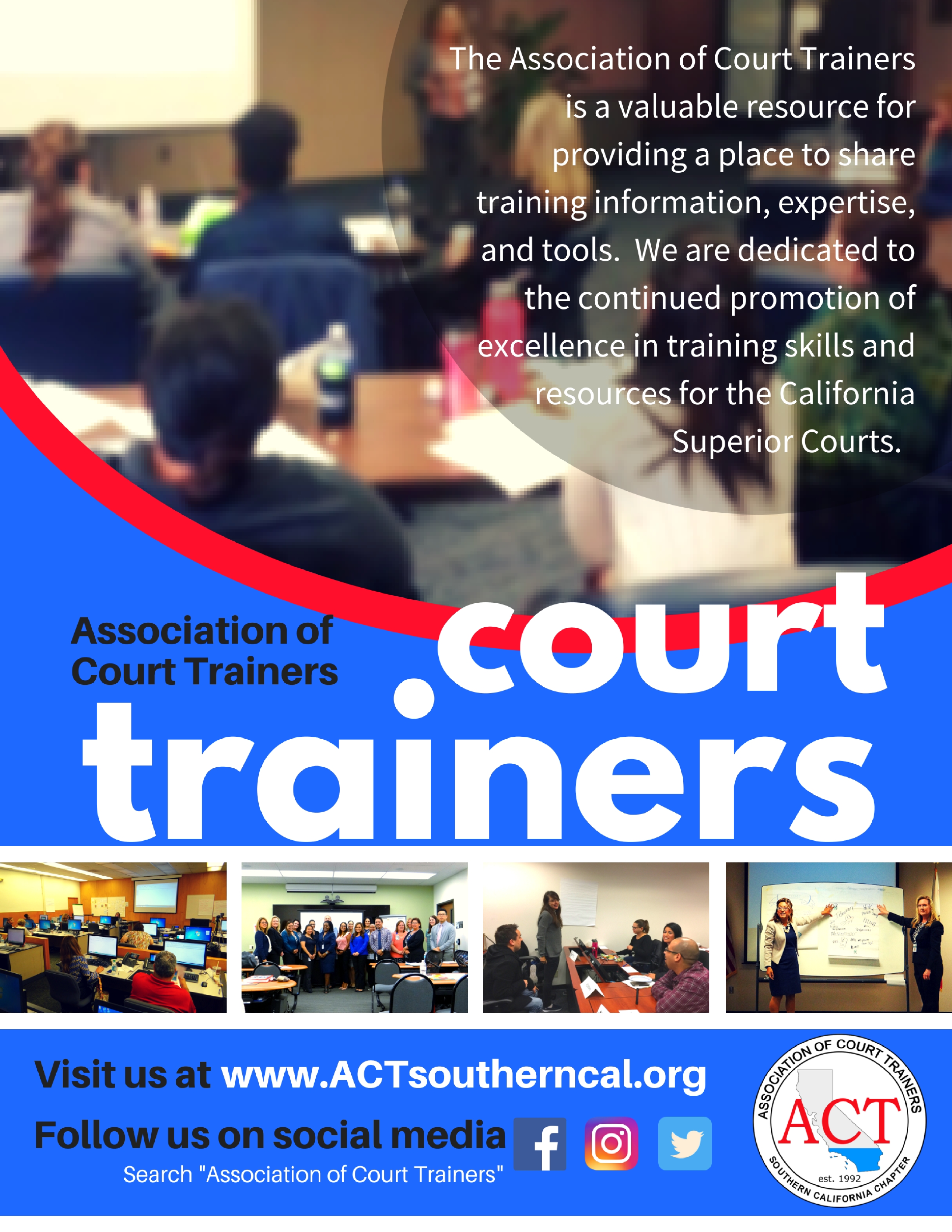 The Association of Court Trainers was formed in 1992 to increase the effectiveness of training in the courts by pooling resources and expertise. The Southern California trial court Administrators Association endorsed its formation.