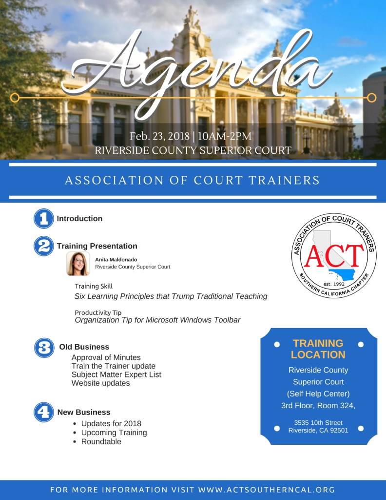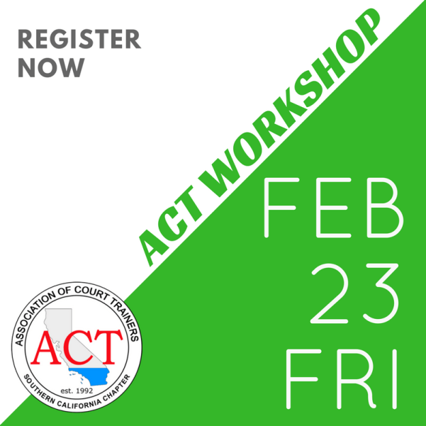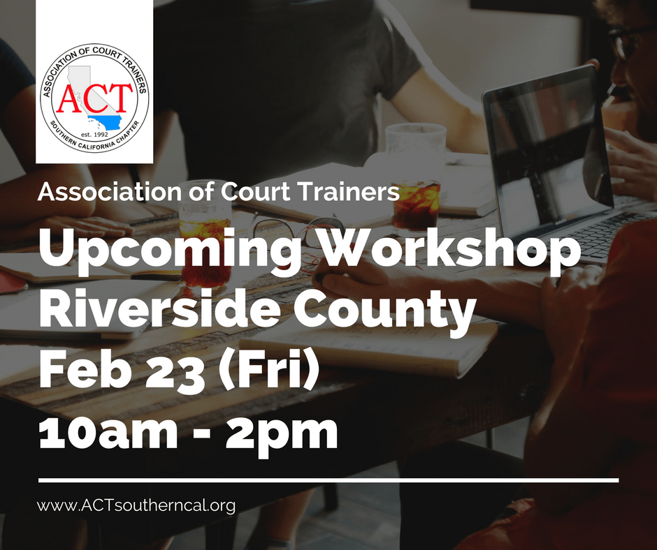 Association of Court Trainers invites you to our upcoming workshop hosted by Riverside County Superior Court Trainers. The workshop will be on Feb. 23 at 10am to 2pm. Further details to follow.